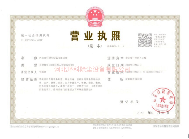河北環科除塵設備有限公司是一家專業生產環保機械產品的高新技術企業、專精特新企業。公司位于河北省滄州市獻縣。公司始建于1989年,公司前身河北通風環保設備廠,2002年成功改制重組為河北環科除塵設備有限公司,注冊資金1.18億元,占地面積100畝,專用生產檢測設備配套齊全。公司以保護環境,造福人類為己任,大力研究設計、生產制造和推廣應用環保產品。 公司成立至今著力開發各類除塵環保產品,在借鑒國內外新技術的基礎上自主研發及改造出多種除塵環保設備,并先后取得了二十余項專利及軟著,取得了廣泛的市